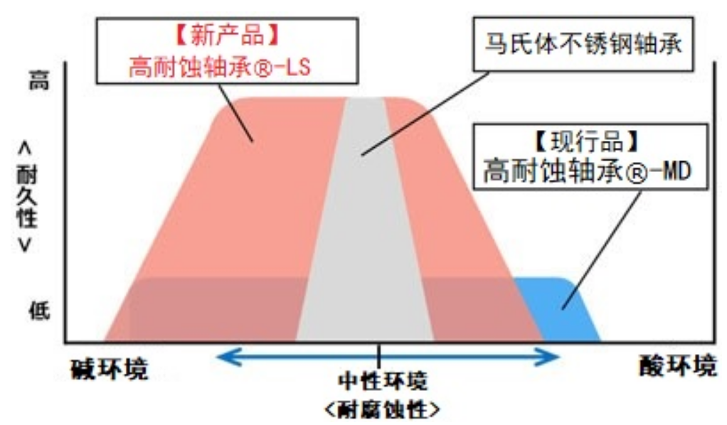 此次开发的新产品适用于普通不锈钢轴承无法对应的腐蚀环境,现行品则适用于新产品不能对应的一部分酸环境。