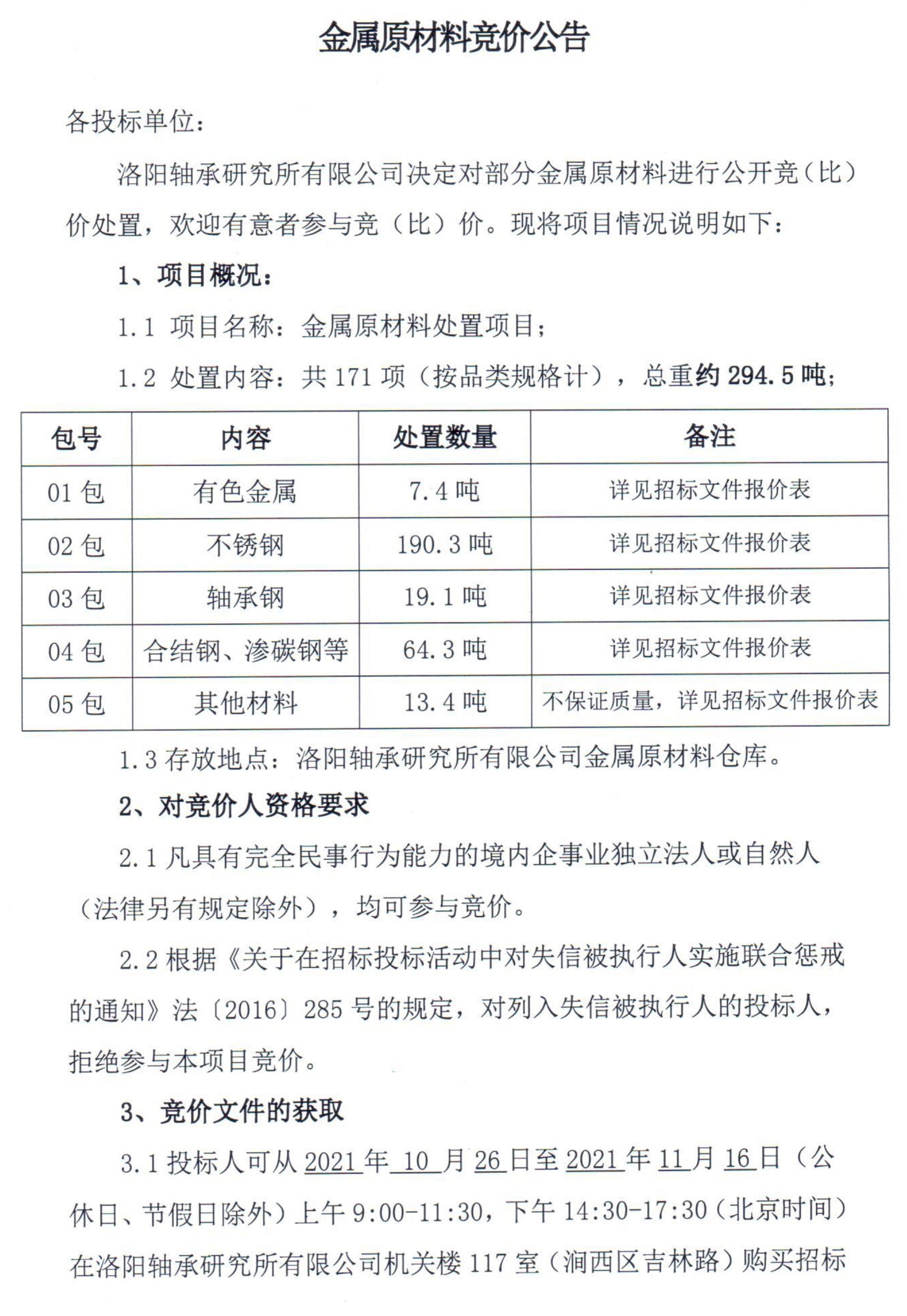 金属原材料竞价公告