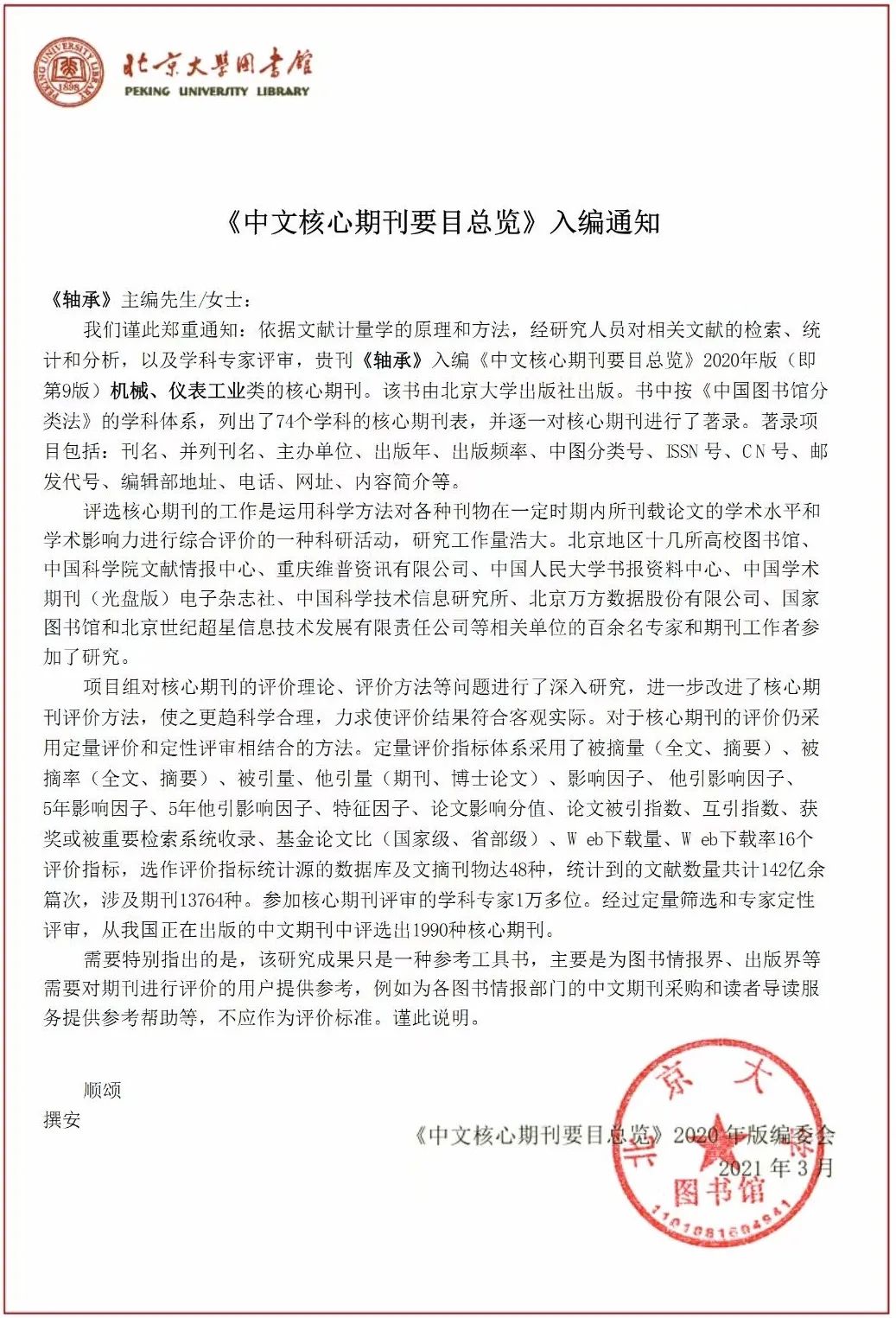 3月11日,《轴承》编辑部收到北京大学图书馆《中文核心期刊要目总览》编委会通知,《轴承》入编《中文核心期刊要目总览》2020年版(第9版)之“机械、仪表工业类”的核心期刊。这也是《轴承》连续第9次入编《中文核心期刊要目总览》。