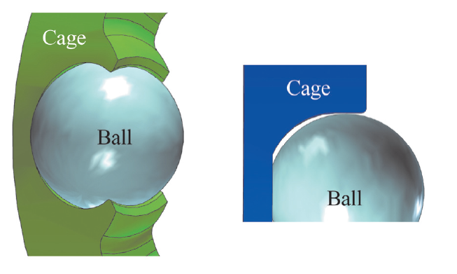 图6 深沟球轴承的球与保持架接触状态(左-常规;右-新开发)