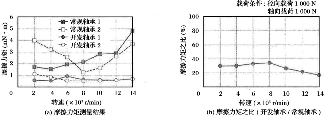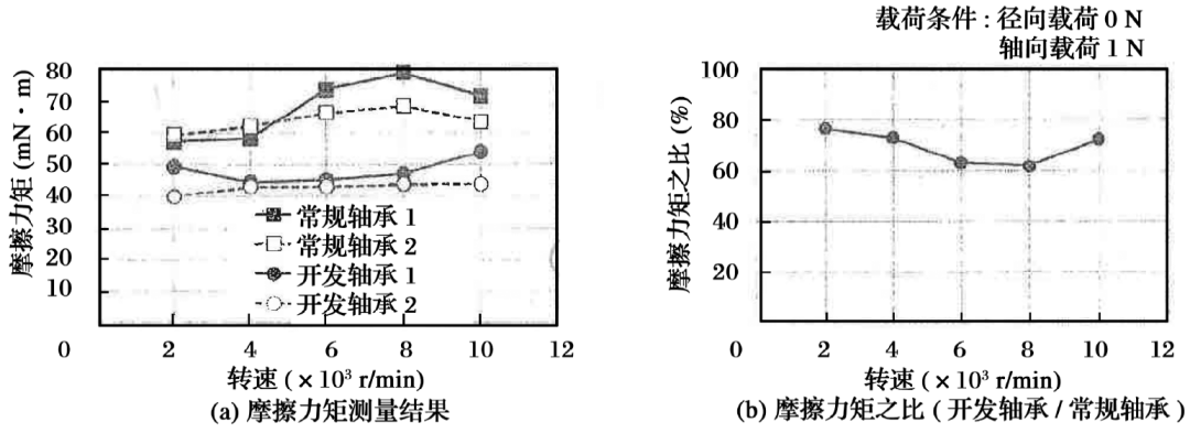 3)在整个转速区,使用开发的新结构保持架使轻轴向载荷作用下的摩擦力矩降低60%以上。