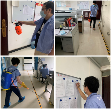 轴研所下属空间轴系开发部在复工当天,组织人员各司其职,按照要求配比消杀溶液,对部门一楼试验区域内产品跑合实验室、更衣室、粗洗间、精洗间、产品性能测试室等共计22个房间和三、四楼办公区的9个办公室及公共区域进行了全方位的消杀工作。各个房间均配有消杀防疫记录表,每次消杀完成后有专人负责检查记录,部门人员已经充分做好了常态化防控疫情的准备。
