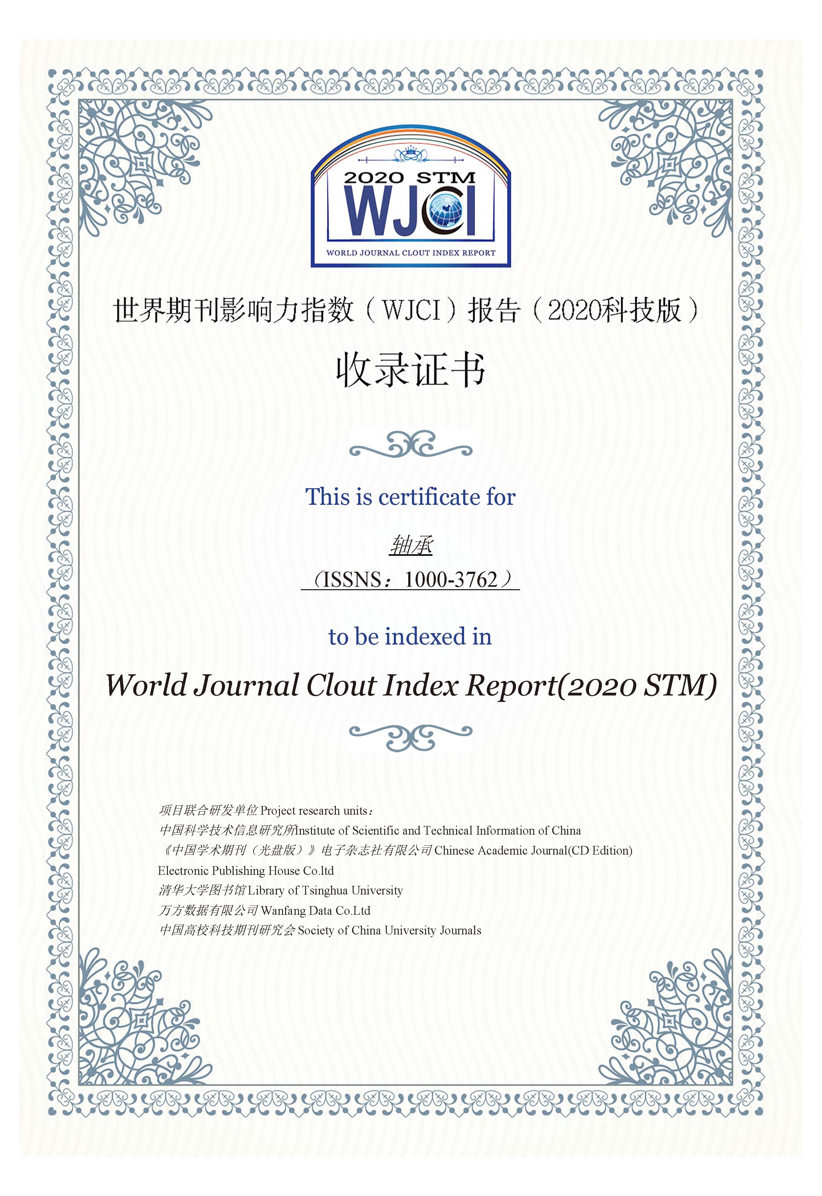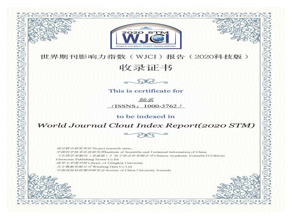 近日,由中国科学技术信息研究所、《中国学术期刊(光盘版)》电子杂志社有限公司、清华大学图书馆、万方数据有限公司、中国高校科技期刊研究会联合研制的期刊评价报告《世界期刊影响力指数(WJCI)报告(2020科技版)》(简称:WJCI报告)发布。《轴承》成功入选WJCI。