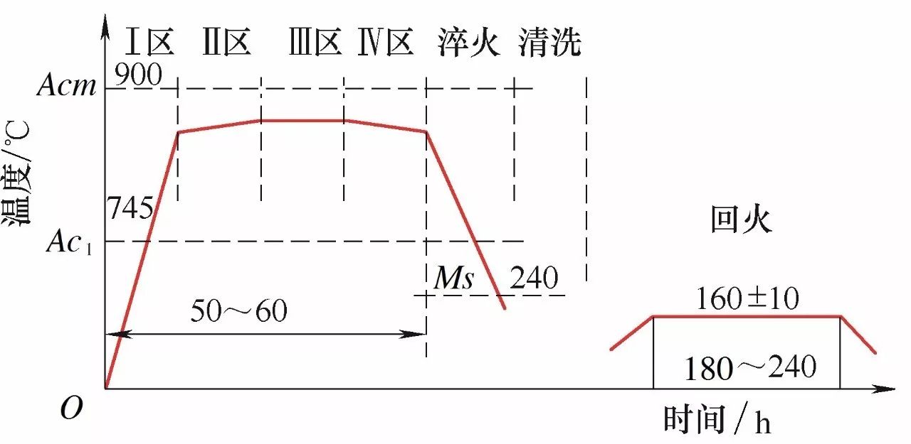 球化退火设备通常使用保护气氛炉,使退火后的零件表面少、无氧化,并能提高轴承零件的材料利用率。轴承材料的加热温度为835~850 ℃,球化温度为750~760 ℃,如图8所示。