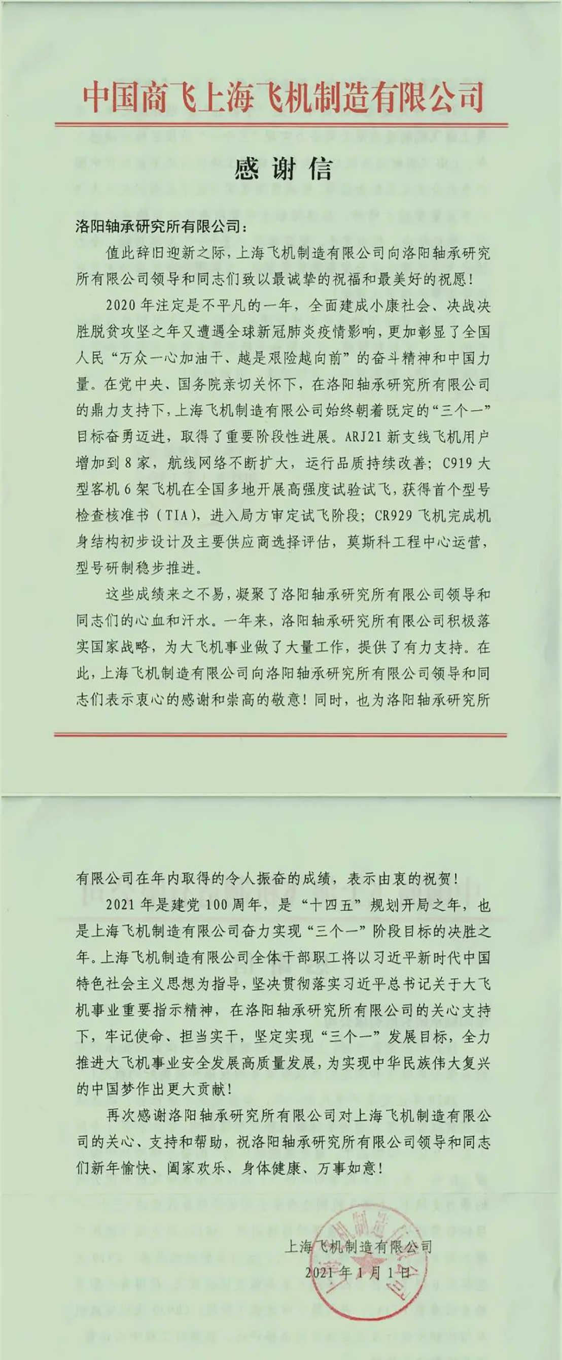 2021年1月,一封来自上海飞机制造有限公司(以下简称“上飞”)的感谢信对轴研所为国产飞机事业的支持表示衷心感谢和崇高敬意,这是对轴研所科研能力、产品品质的充分认可!