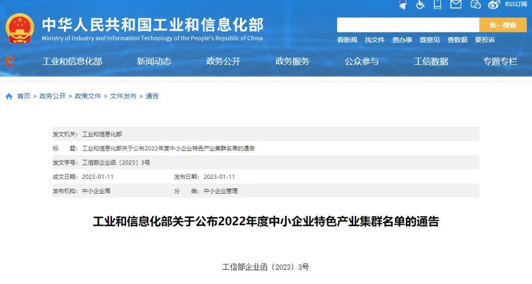 按照《促进中小企业特色产业集群发展暂行办法》(以下简称《暂行办法》)(工信部企业〔2022〕119号)和《工业和信息化部办公厅关于组织推荐2022年度中小企业特色产业集群的通知》(工信厅企业函〔2022〕236号),经各省级中小企业主管部门组织申报推荐、专家评审和公示,确定了100家2022年度中小企业特色产业集群(名单见附件,以下简称集群),现予以通告,并提出有关工作要求。