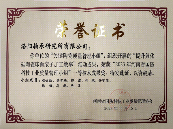 近日,由轴研所制造服务事业部特种材料开发部组织开展的“提升氮化硅陶瓷球面滚子加工效率”项目,荣获“2023年河南省国防科技工业质量管理小组”一等技术成果奖。