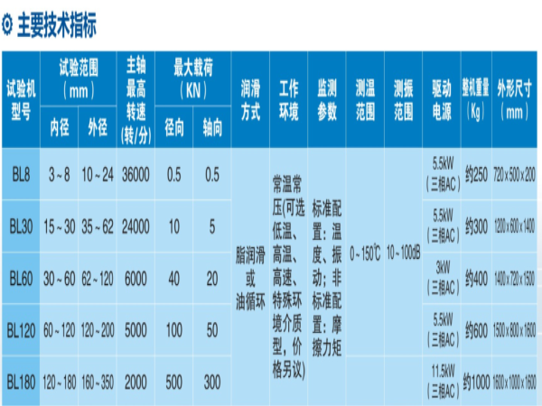 设备设计合理,性能稳定可靠,试验过程中不改变被试轴承的失效机理。BL系列滚动轴承动态性能试机可以根据需要增加摩擦力矩测试等功能。该设备适合轴承生产厂家对成品轴承的寿命和可靠性进行评估,为改进设计、完善加工工艺、优选材料、产品定型提供依据,也适合油脂厂通过试验改进润滑脂的性能。