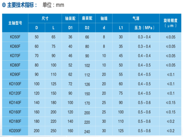 注: 1.空气轴承无凸缘系列与上述尺寸基本相同,型号后不带F (无座装配尺寸D2 ) ;